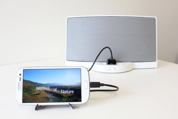 A single cable connects Samsung Galaxy devices to the world of iPod and iPhone docks. Plug in. Charge. Play music.